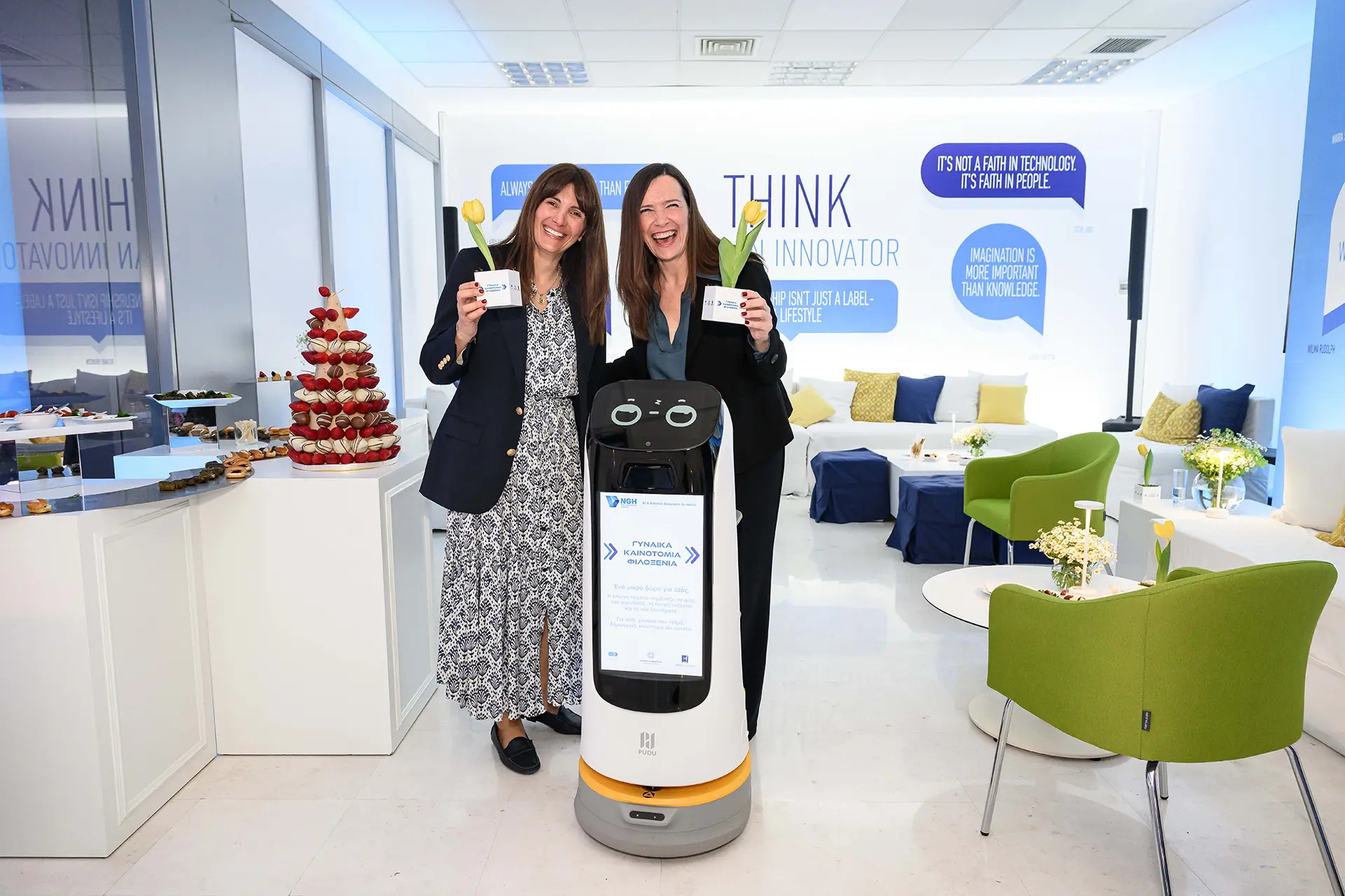 A robot giving gifts to female guests